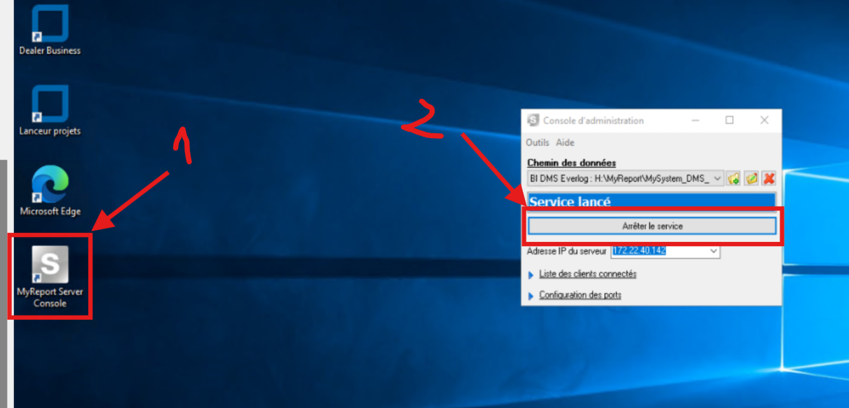 Ouvrir MyReport Sever Console (1) arrêter puis relancer le service (2) :
